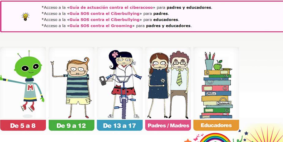 Guías de actuación contra el ciberacoso, ciberbullying y Grooming para padres, madres, educadores y educadoras. Se trata de una iniciativa puesta en marcha por la «Oficina de Seguridad de Internautas» con el firme objetivo de fomentar la cultura de la seguridad en Internet entre las niñas y los niños. Puede resultar un buen método de prevención y detección; como multiplicar las precauciones para que hagan un buen uso de la red. Acceder a la página: Menores OSI!