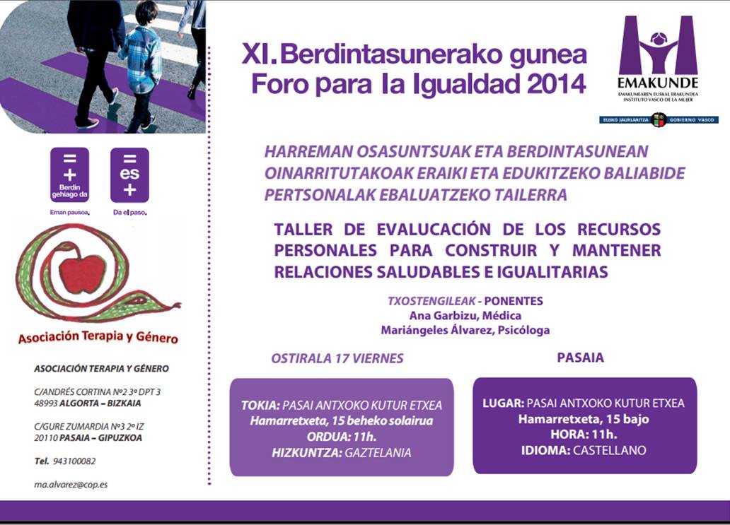 La Asociación Terapia y Género, en el marco del Foro para la Igualdad 2014 de Emakunde, impartirá un taller el viernes 17 de octubre en Pasaia Antxo (Kultur Etxea), a las 11:00 de la mañana. Las ponentes son Ana Garbizu, Médica y Mariángeles Álvarez, Psicóloga.