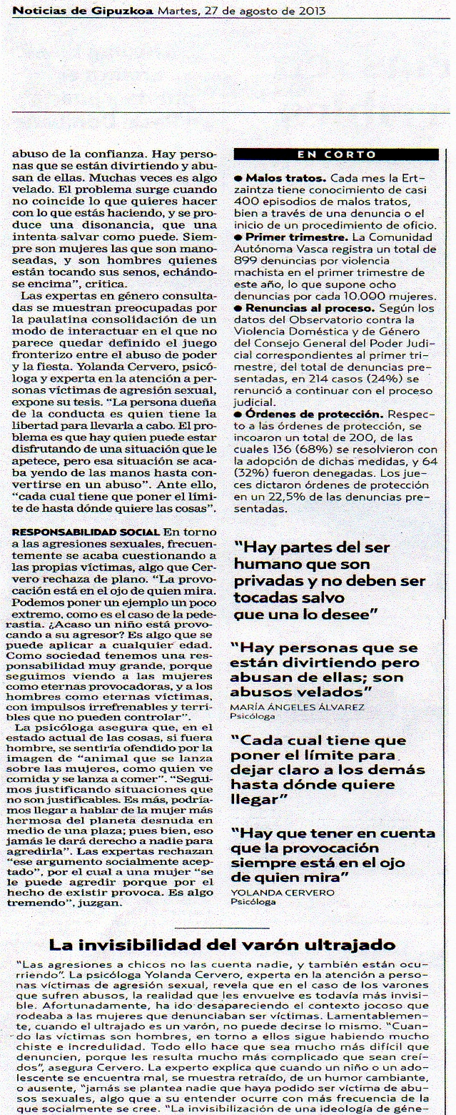 Noticias de Gipuzkoa 2013/08/27 Creciente preocupación por las agresiones machistas ocurridas en fiestas este verano.